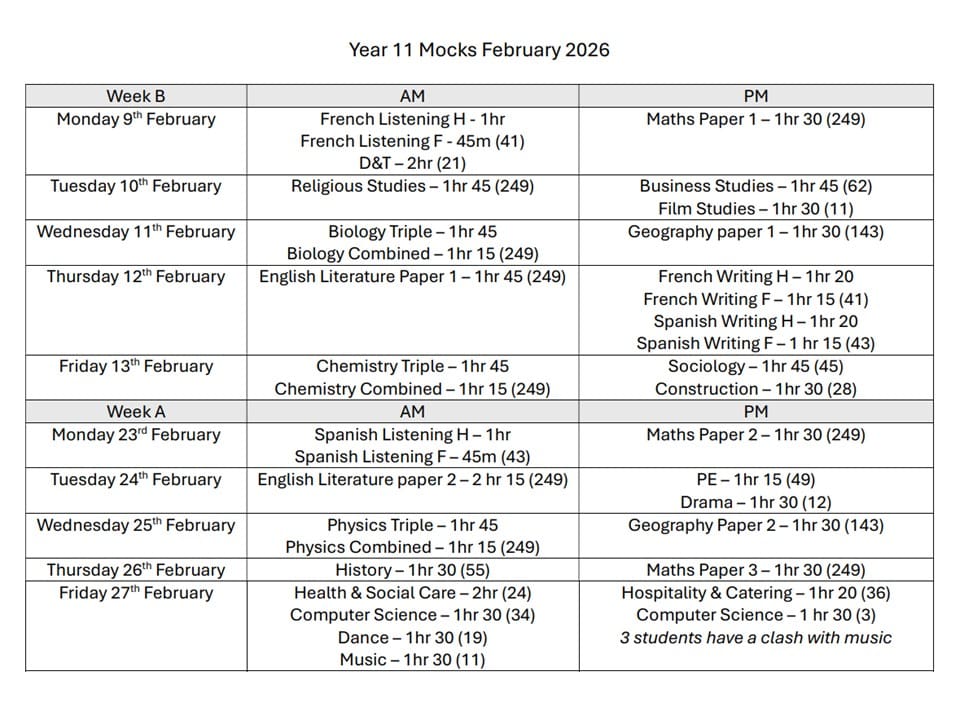 Y11 Summer GCSE Examination Timetable (Published in January)